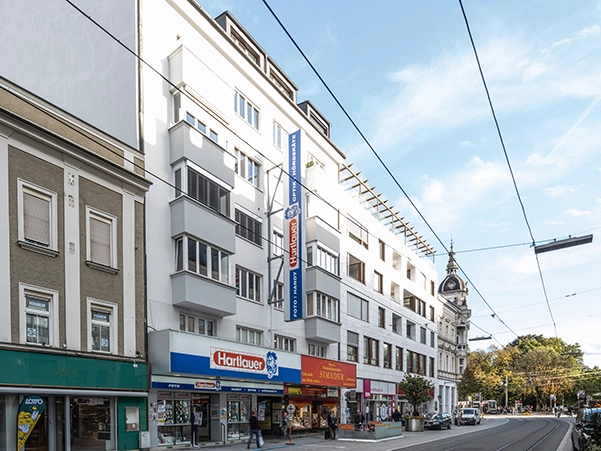 Nach Abschluss der Fassadensanierung im Jahr 2020 erstrahlt das moderne Wohn- und Geschäftshaus an der bekannten Linzer Einkaufsstraße